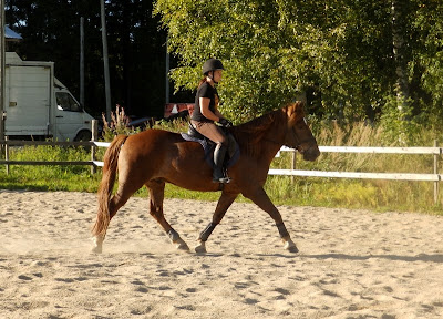Tämäkin päivä meni siellä, aamulla ensin heräiltiin ja jutusteltiin paikan omistajien kanssa. Käväisin kotona ja heti takaisin vaan ratsastamaan söpöllä pv- tammalla. Sitten vielä hengailua ja syömistä jokunen tovi, koko päivä oikeastaan siellä vierähtikin. Mutta oli kivaa! :)